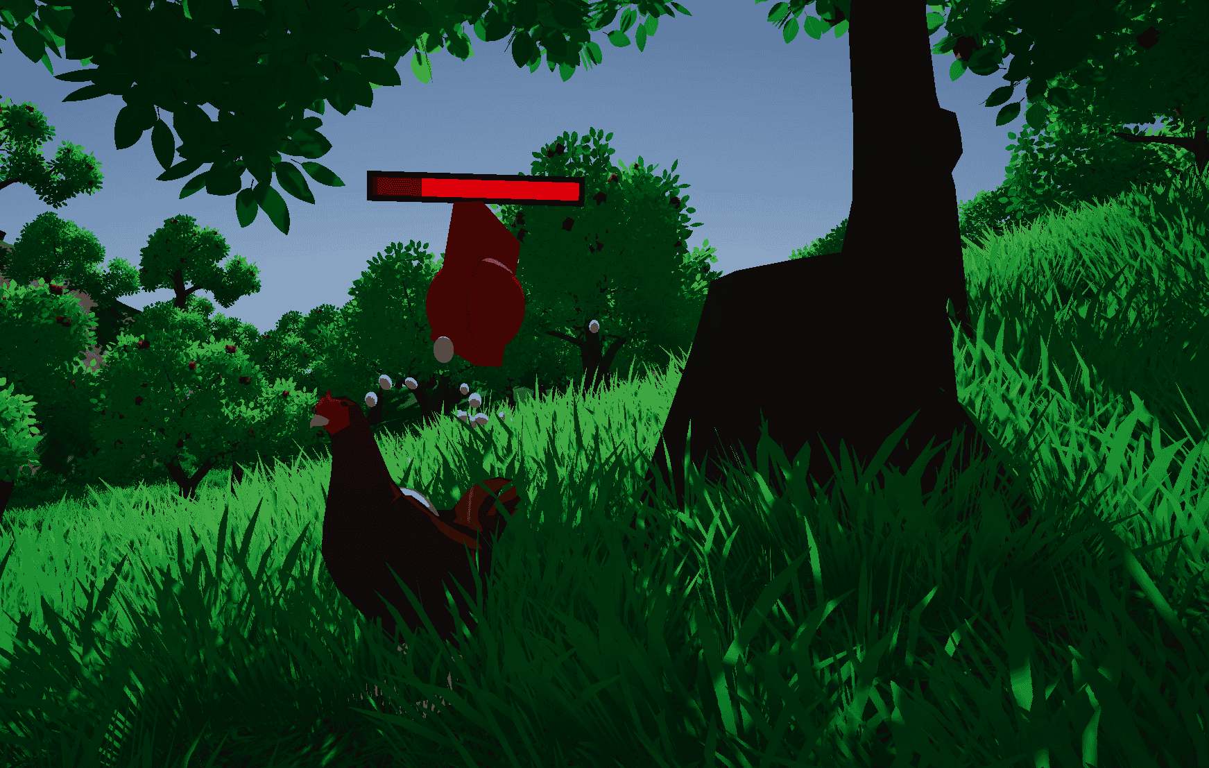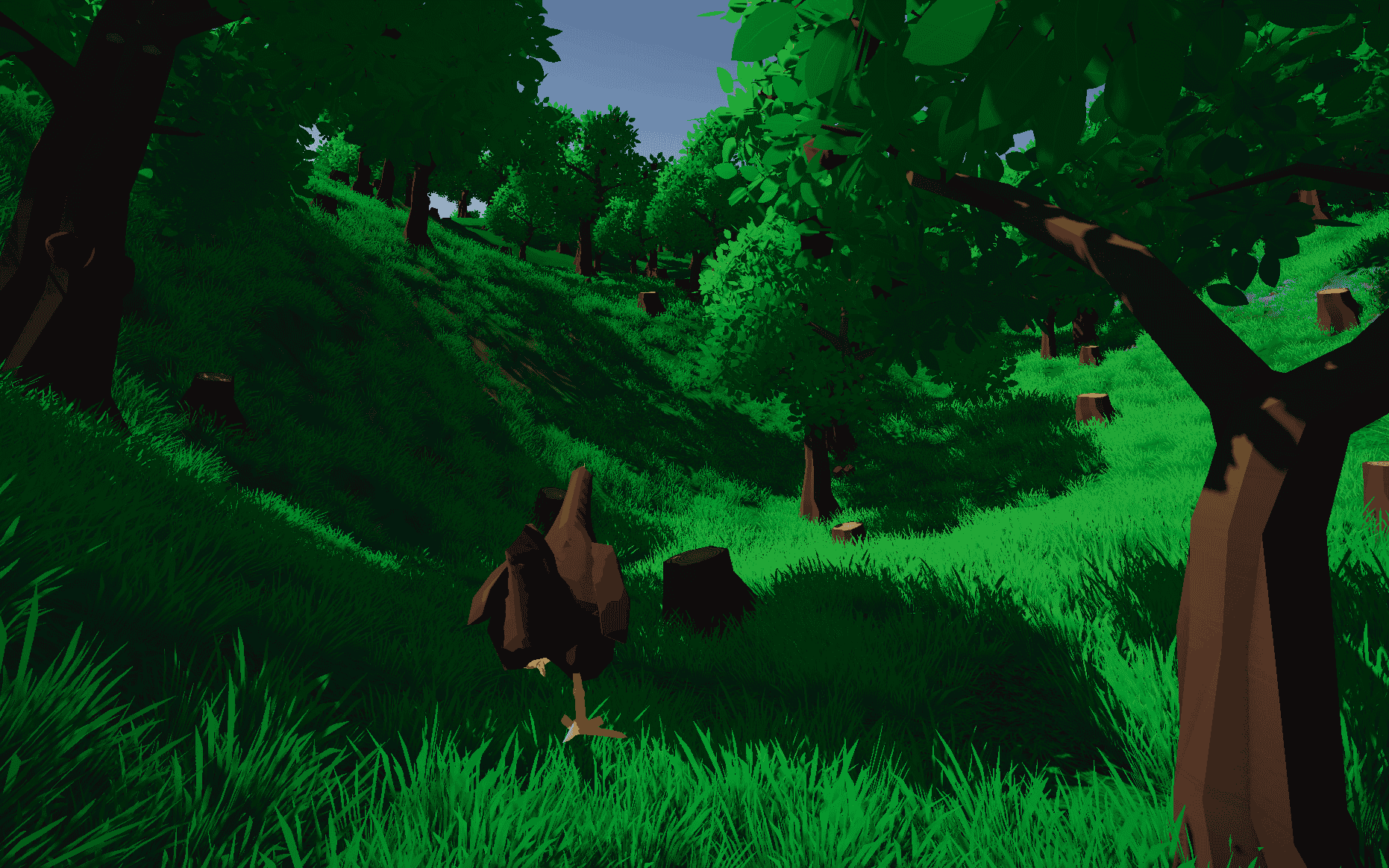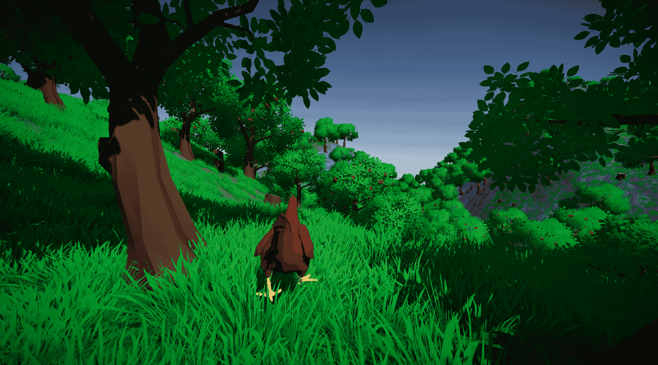 - Stylized visuals: Bright colors, dense grass, simple shapes, and a custom toon shader that makes everything pop.